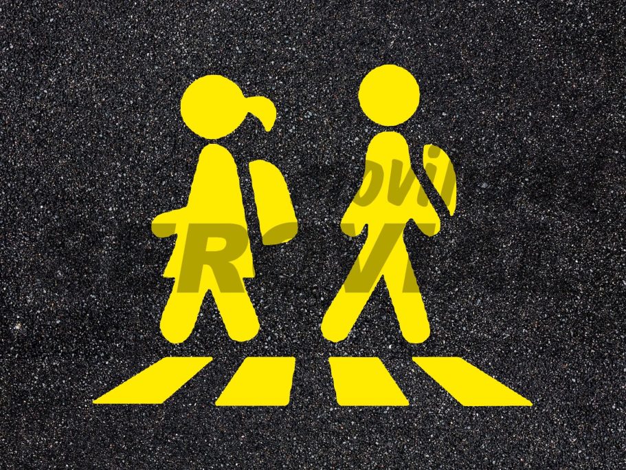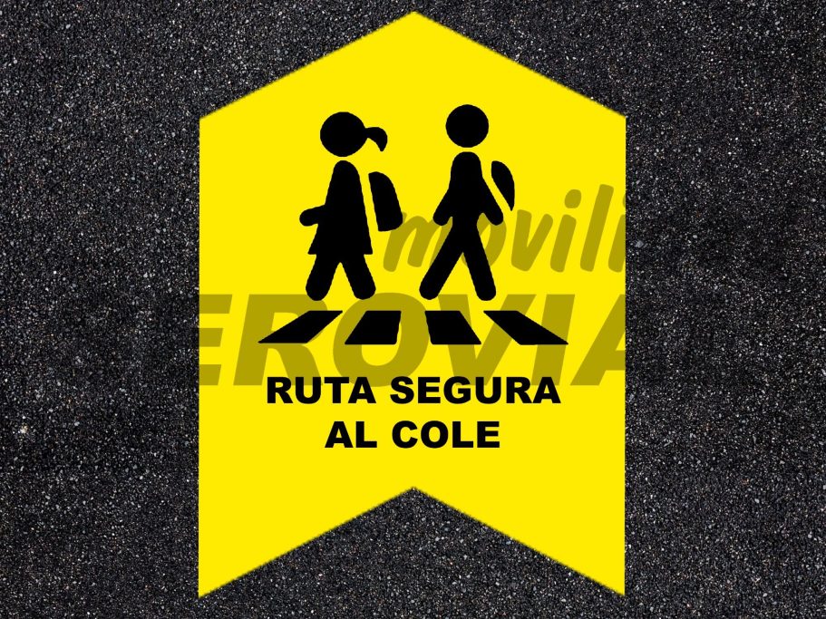 Plantilla de señalización horizontal para marcación de diseño "RUTA SEGURA AL COLE" en suelo. Reutilizable y compatible con todo tipo de pinturas y suelos. Se fabrican en planchas (acero o aluminio) o en PVC. Dimensiones y pictogramas según normativa.