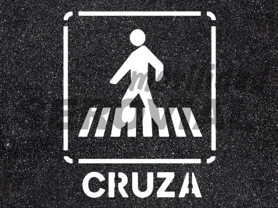 Plantilla de señalización horizontal para marcación de mensaje "CRUZA" en suelo. Reutilizable y compatible con todo tipo de pinturas y suelos. Se fabrican en planchas (acero o aluminio) o en PVC. Dimensiones y pictogramas según normativa.