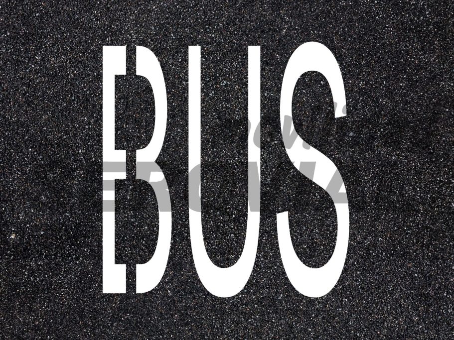 Plantilla de señalización horizontal para marcación de palabra "BUS" en suelo. Reutilizable y compatible con todo tipo de pinturas y suelos. Se fabrican en planchas (acero o aluminio) o en PVC. Dimensiones y pictogramas según normativa.