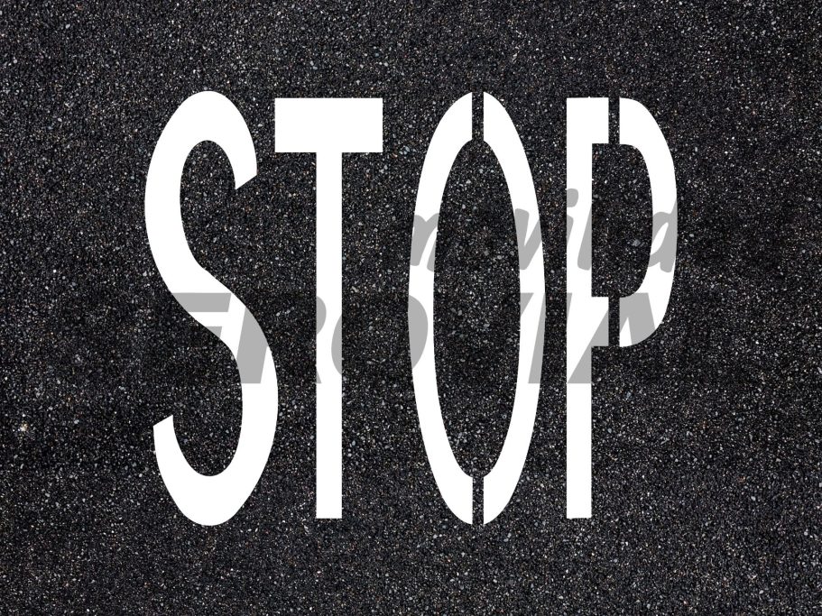 Plantilla de señalización horizontal para marcación de palabra "STOP" en suelo. Reutilizable y compatible con todo tipo de pinturas y suelos. Se fabrican en planchas (acero o aluminio) o en PVC. Dimensiones y pictogramas según normativa.