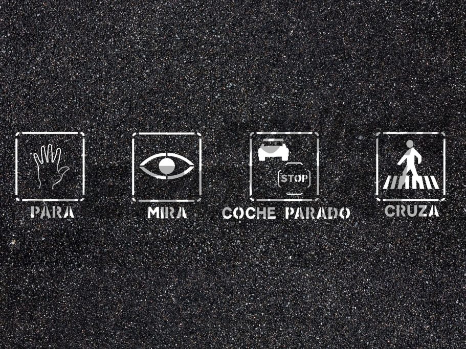 Plantilla de señalización horizontal para marcación de conjunto "PARA-MIRA-COCHE PARADO-CRUZA" en suelo. Reutilizable y compatible con todo tipo de pinturas y suelos. Se fabrican en planchas (acero o aluminio) o en PVC. Dimensiones y pictogramas según normativa.