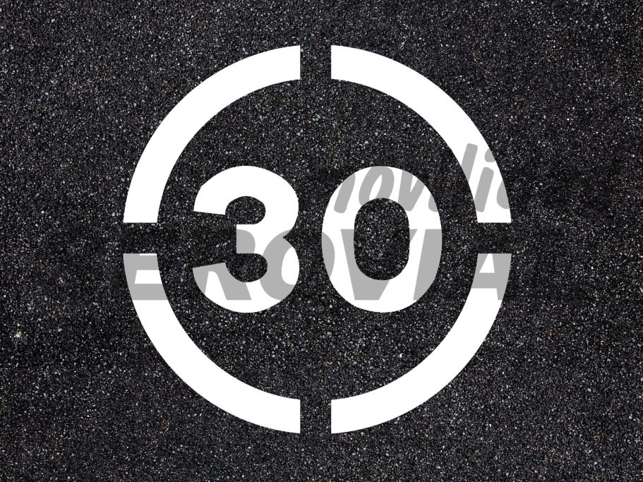 Plantilla de señalización horizontal para marcación de limitación de velocidad en suelo. Reutilizable y compatible con todo tipo de pinturas y suelos. Se fabrican en planchas (acero o aluminio) o en PVC. Dimensiones y pictogramas según normativa.