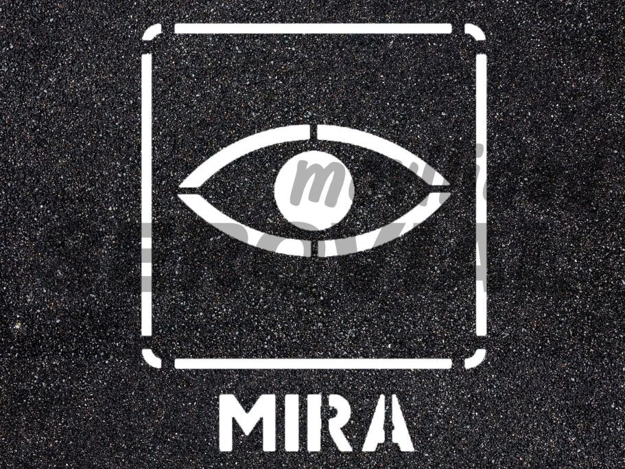 Plantilla de señalización horizontal para marcación de símbolo "MIRA" en suelo. Reutilizable y compatible con todo tipo de pinturas y suelos. Se fabrican en planchas (acero o aluminio) o en PVC. Dimensiones y pictogramas según normativa.