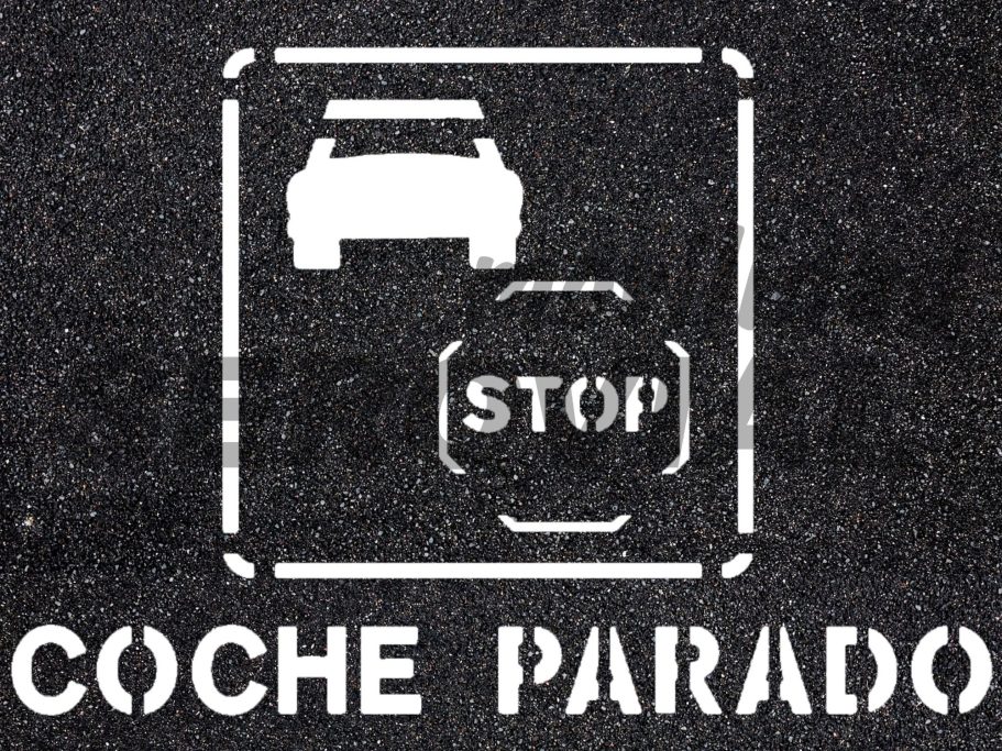 Plantilla de señalización horizontal para marcación de mensaje "COCHE PARADO" en suelo. Reutilizable y compatible con todo tipo de pinturas y suelos. Se fabrican en planchas (acero o aluminio) o en PVC. Dimensiones y pictogramas según normativa.